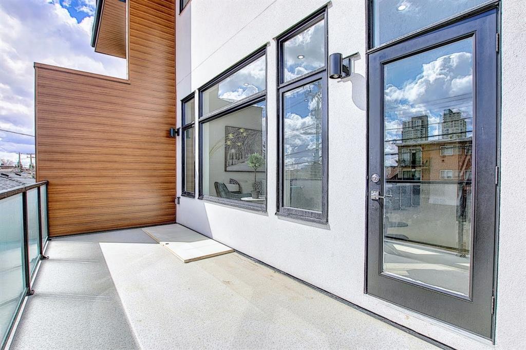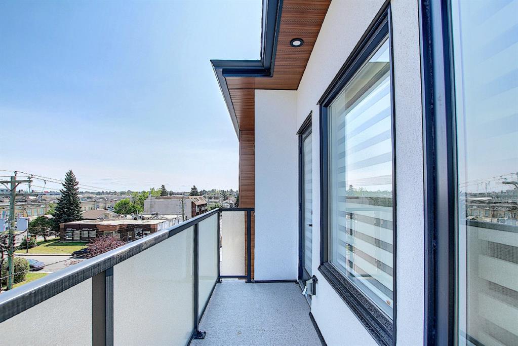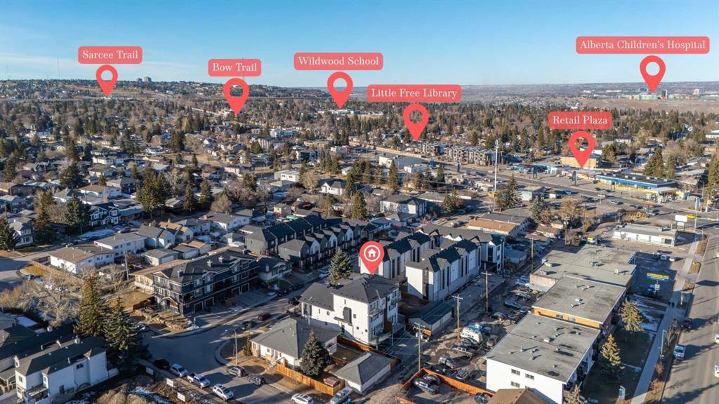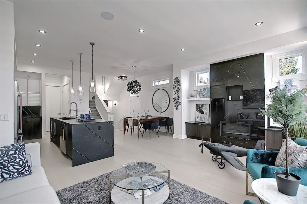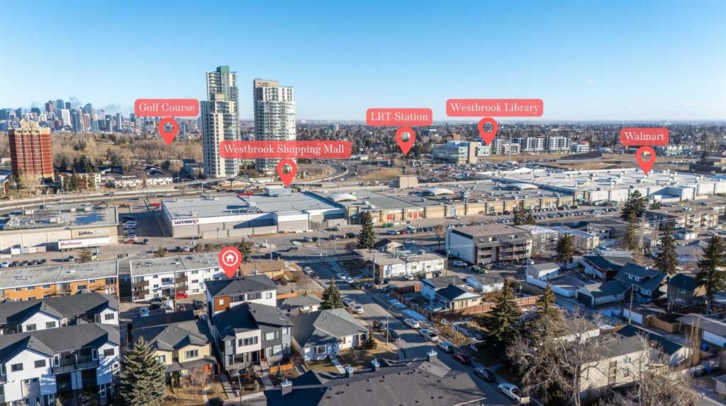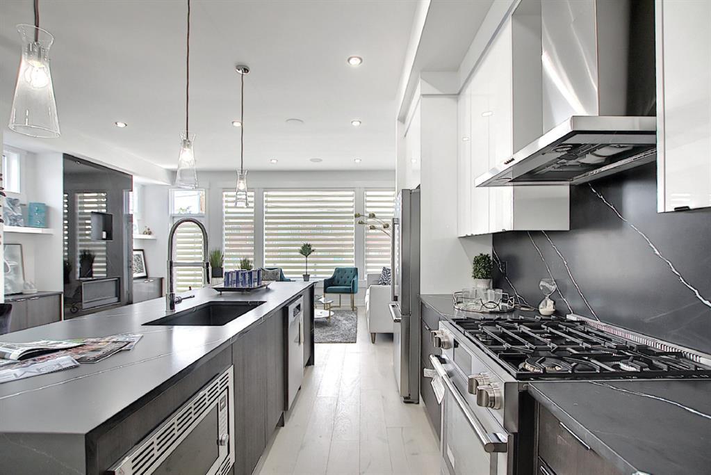 This upscale 3-storey dream home is centrally located on the Westside of Calgary in the inner-city community of Rosscarrock. The unit is located on the back Northside of the building, offering 2125 sqft of developed living space with both views of the community as well as downtown Calgary. It’s M-C2 zoning make it uniquely suited for home-based businesses or a work from home lifestyle. Main floor features a spacious open concept layout with 10-foot ceilings, large windows draw in natural light and stunning engineered oak hardwood floors. Gourmet kitchen is equipped with a European Blomberg appliance package, premium quartz countertops/backsplash, and a large island with a double waterfall feature. The living area is centered around a gas fireplace with marble tile surround, leading to a large deck with a gas BBQ hookup. Luxurious finishes throughout include heated tile floors & sound-enabled backlit LED mirrors in bathrooms, solid 8′ doors and a built in Bluetooth speaker system. Second and third levels offer double primary suites and a third-floor flex room with its own wet bar and a private deck overlooking the community. The second-floor primary suite offers a large walk-in closet and spa-inspired ensuite (jetted tub, shower, double vanities). A second large bedroom and laundry room can also be found on this level. The third-floor primary suite features a private deck with downtown views and a gorgeous ensuite. Building is professionally managed, reasonable condo fees – move in and enjoy a maintenance-free lifestyle. Single attached garage is roughed in with an Electric Vehicle charging station + another parking spot on your driveway. No permits are required for additional street parking. High efficiency furnace, tankless hot water system, central A/C + humidifier. Impressive curb appeal with high-end modern exterior finishes & architectural design. This incredible home is located within a few minutes commute to downtown Calgary, steps from major amenities including Westbrook Mall, Starbucks, Safeway & Walmart. Steps to Westbrook Mall LRT Station and major transit routes. Located within proximity to a Nicholls Family Public Library, Shaganappi Point Golf Course, an aquatics center, bike & walking paths, schools and local shops and restaurants.