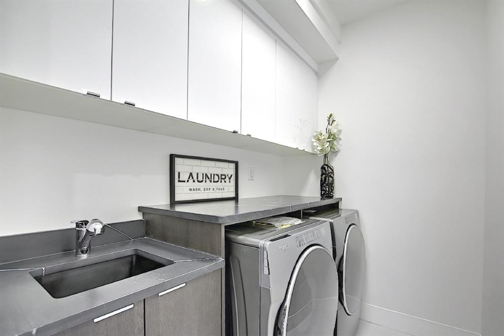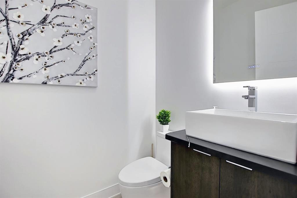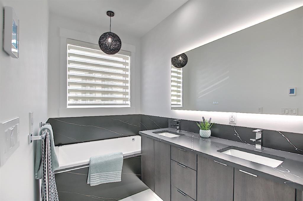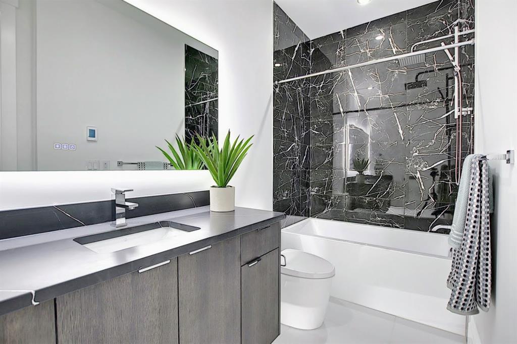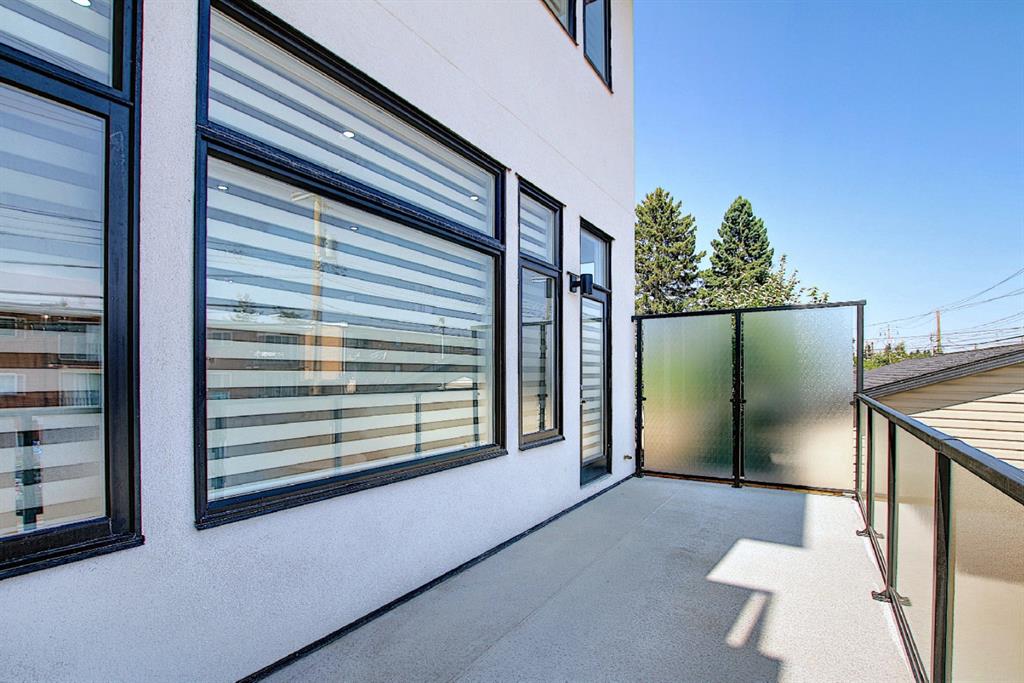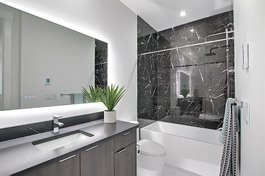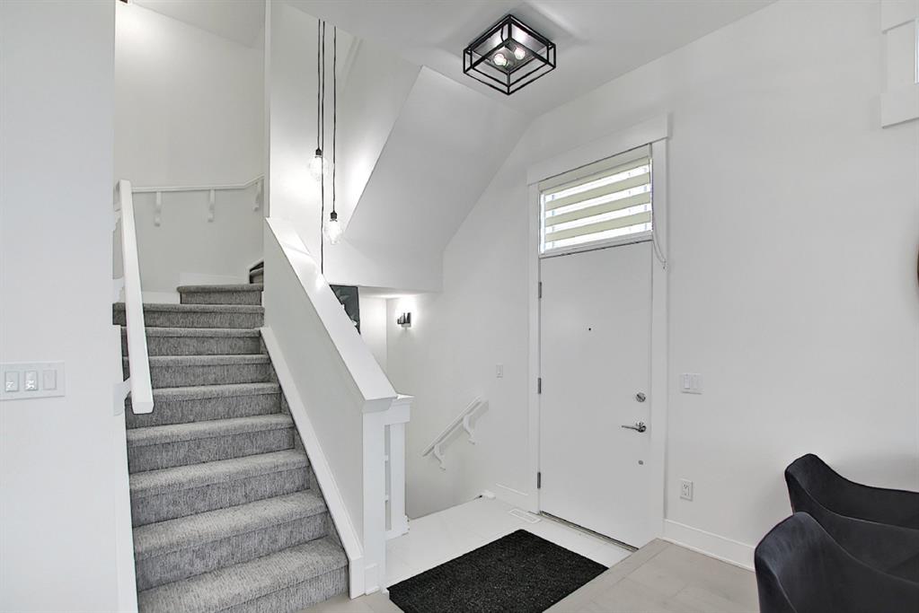 This upscale 3-storey dream home is centrally located on the Westside of Calgary in the inner-city community of Rosscarrock. The unit is located on the back Northside of the building, offering 2125 sqft of developed living space with both views of the community as well as downtown Calgary. It’s M-C2 zoning make it uniquely suited for home-based businesses or a work from home lifestyle. Main floor features a spacious open concept layout with 10-foot ceilings, large windows draw in natural light and stunning engineered oak hardwood floors. Gourmet kitchen is equipped with a European Blomberg appliance package, premium quartz countertops/backsplash, and a large island with a double waterfall feature. The living area is centered around a gas fireplace with marble tile surround, leading to a large deck with a gas BBQ hookup. Luxurious finishes throughout include heated tile floors & sound-enabled backlit LED mirrors in bathrooms, solid 8′ doors and a built in Bluetooth speaker system. Second and third levels offer double primary suites and a third-floor flex room with its own wet bar and a private deck overlooking the community. The second-floor primary suite offers a large walk-in closet and spa-inspired ensuite (jetted tub, shower, double vanities). A second large bedroom and laundry room can also be found on this level. The third-floor primary suite features a private deck with downtown views and a gorgeous ensuite. Building is professionally managed, reasonable condo fees – move in and enjoy a maintenance-free lifestyle. Single attached garage is roughed in with an Electric Vehicle charging station + another parking spot on your driveway. No permits are required for additional street parking. High efficiency furnace, tankless hot water system, central A/C + humidifier. Impressive curb appeal with high-end modern exterior finishes & architectural design. This incredible home is located within a few minutes commute to downtown Calgary, steps from major amenities including Westbrook Mall, Starbucks, Safeway & Walmart. Steps to Westbrook Mall LRT Station and major transit routes. Located within proximity to a Nicholls Family Public Library, Shaganappi Point Golf Course, an aquatics center, bike & walking paths, schools and local shops and restaurants.